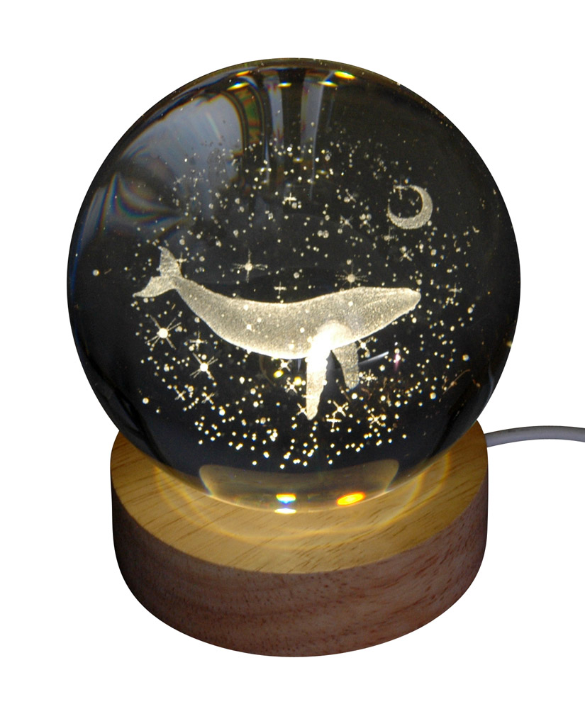 Hochwertige Klarglas Kugel mit aufwendig eingelaserter Buckelwal. Inklusive edlem LED-Untersetzer aus feinem Holz mit USB-Kabel.